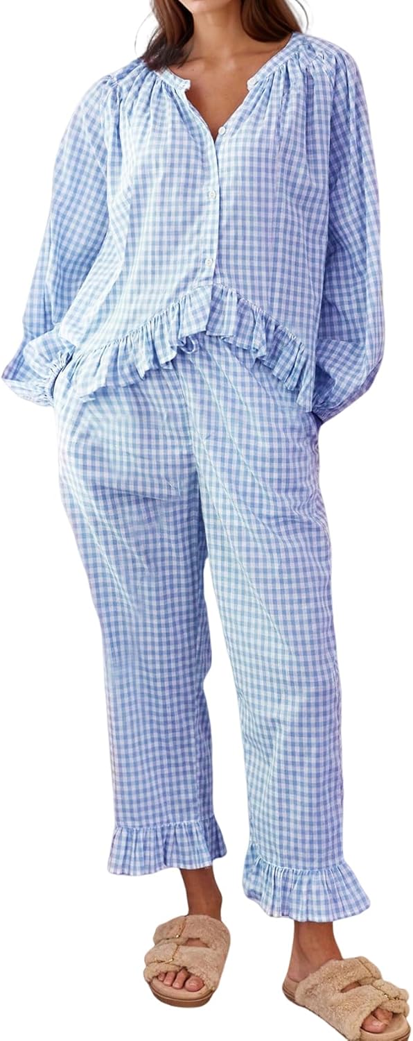 Wyeysyt Womens Gingham Pajamas Set 2 Piece Plaid Cotton Long Sleeve Babydoll Shirt and Ruffle Pants Y2K Pjs Lounge Set