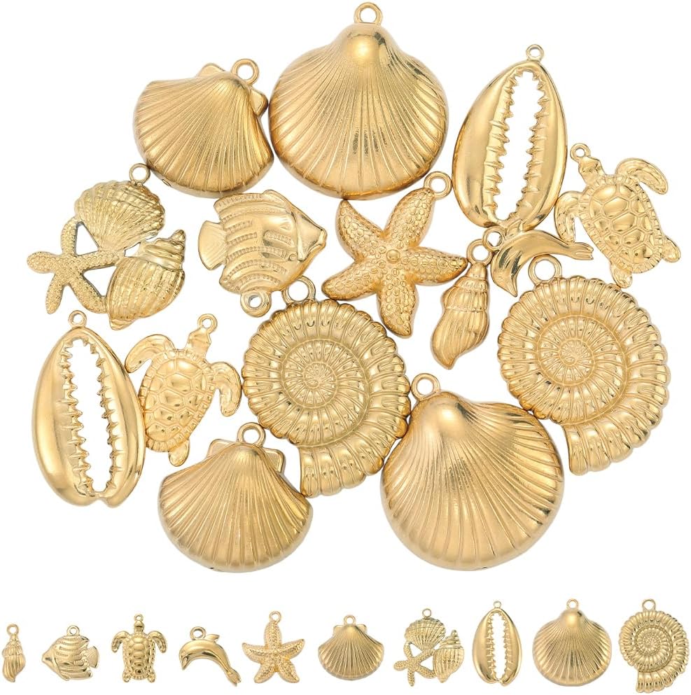 SUNNYCLUE 1 Box 20Pcs 10 Styles Real 18k Gold Plated Ocean Beach Charms Sea Animal Charms Summer Life Dolphin Starfish Turtle Shell Pendants for Jewelry Making Supplies Earring Necklace Bracelet