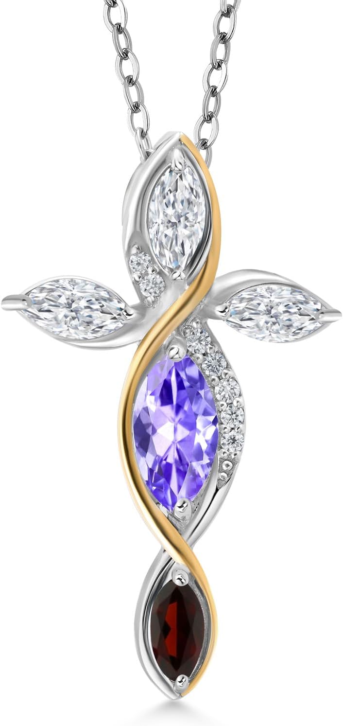 Cross Necklace For Women In 925 Silver and 10K Yellow Gold with Blue Tanzanite and White Moissanite and Garnet | 1.38 Cttw | Jesus Christian Religious Crucifix | Marquise 8X4MM | With 18 Inch Chain