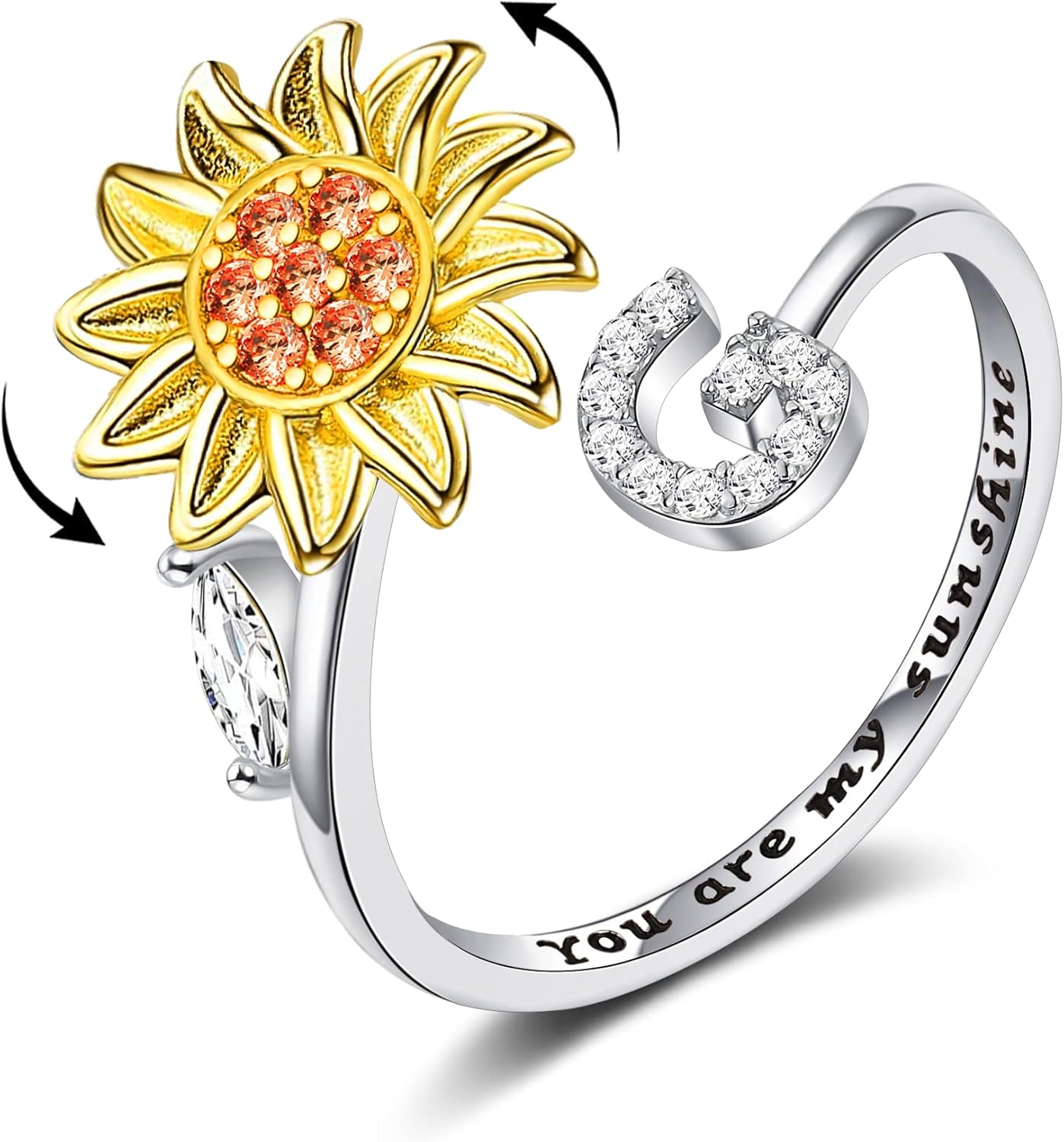 WFYOU Fidget Rings for Anxiety for Women Sunflower Initial Letter Spinner Open Adjustable Ring CZ Daisy Stress Relieving Rings Jewelry Gift for Women Valentine's Day You are My Sunshine Ring