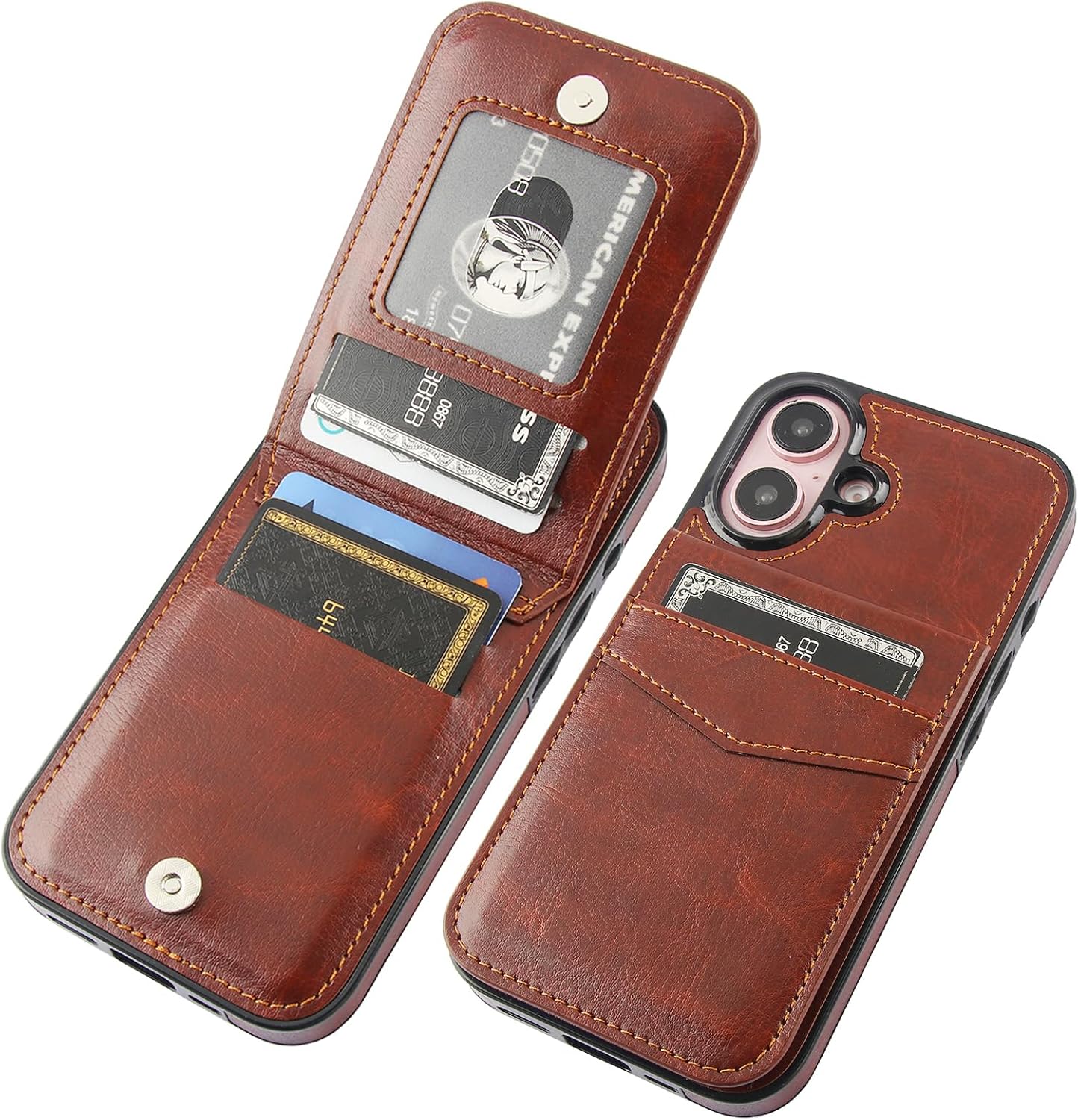 KIHUWEY Compatible with iPhone 16 Case Wallet with Credit Card Holder, Flip Premium Leather Magnetic Clasp Kickstand Heavy Duty Protective Cover for iPhone 16 6.1 Inch (Brown)