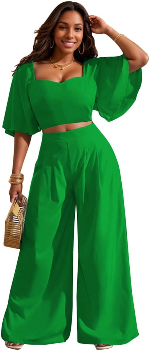WUSENST Women's Summer 2 Piece Outfits 2025 Ruffle Sleeve Sweetheart Neck Crop Tops Wide Leg Pant Sets Casual Tracksuit