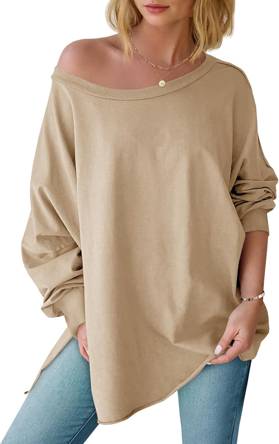 Tankaneo Womens Oversized Off The Shoulder Tops Long Sleeve Trendy Casual T-Shirts Side Slit Loose Fit Tunic Shirts