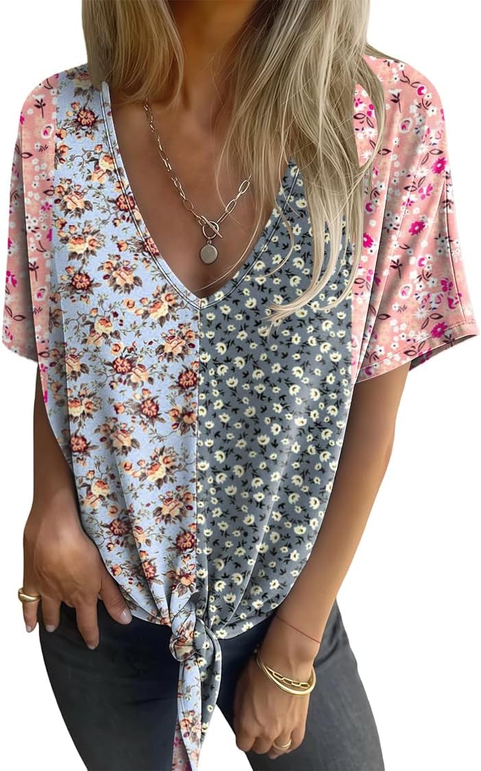Women's Summer Tops Trendy V Neck Tie Front T-Shirt Casual Short Sleeve Loose Fit Top Blouses