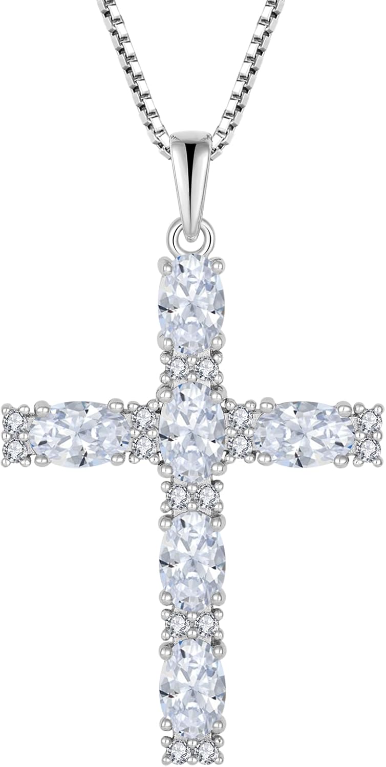 Cross Necklace for Women 925 Sterling Silver Oval Cut Birthstone Pendant Necklace Religious Jewelry Gifts for Women