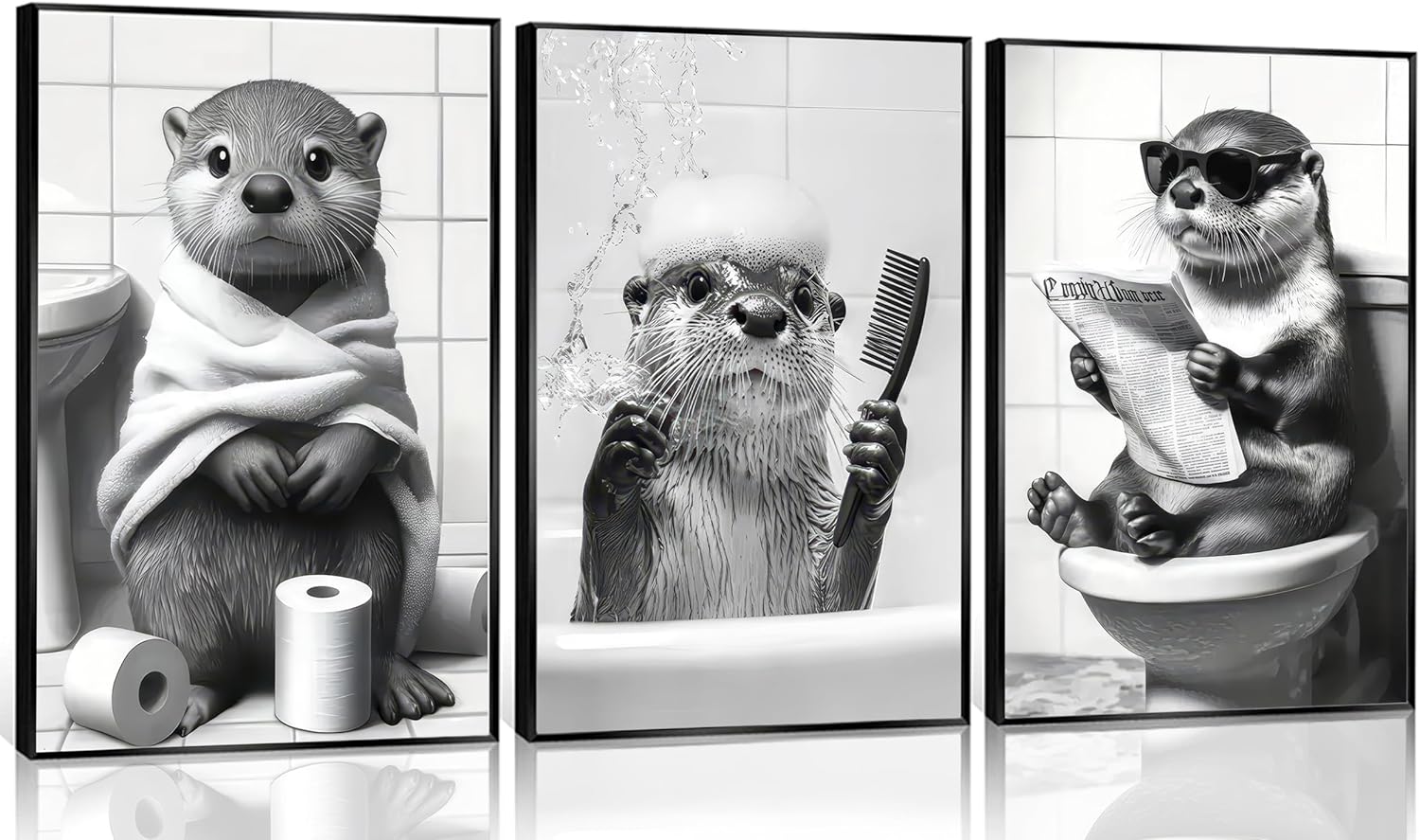 - Black and white bathroom :Transform your bathroom into a delightful sanctuary with our fun bathroom canvas wall art, which includes a cute otter wrapped in a towel holding toiletries and a funny otter wearing glasses and reading a newspaper while sitting on the toilet.This elegant black and white animal poster print brings charm and humor to any restroom, creating a lighthearted atmosphere perfect for relaxation or entertaining guests