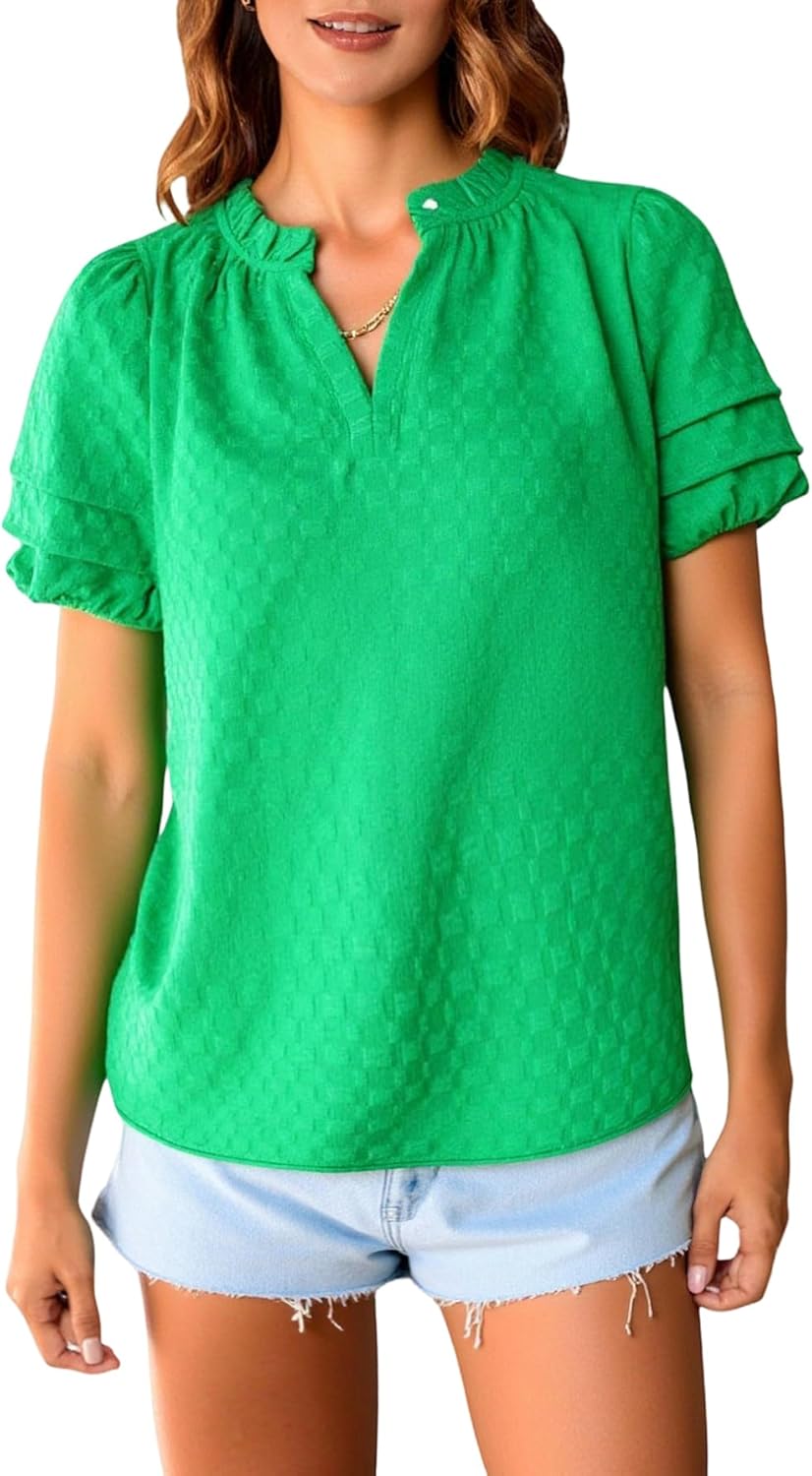 Women's Summer Puff Sleeve Tops Dressy Casual Notch V Neck Loose Blouse Beach Vacation Clothes