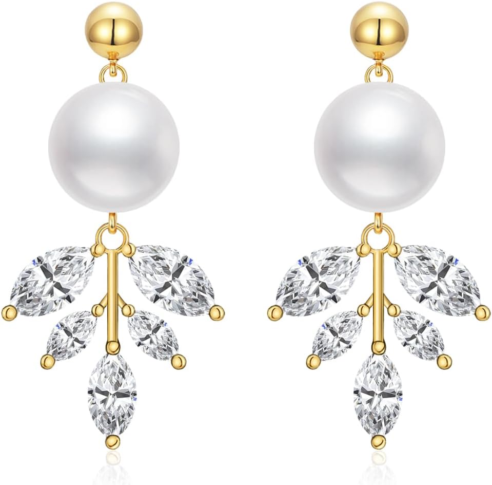 LONAGO Pearl Earrings for Women Dainty 14K Gold Plated Dangle Drop Studs 925 Sterling Silver Bridal Leaf Pearl Cubic Zirconia Stud Earring Wedding Jewelry Gifts
