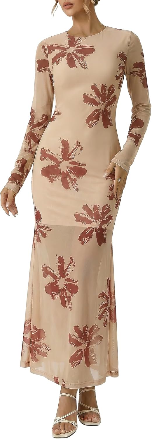 Women's Floral Mesh Cocktail Dresses Long Sleeve Formal Wedding Guest Dress Party Date Night Elegant Dress
