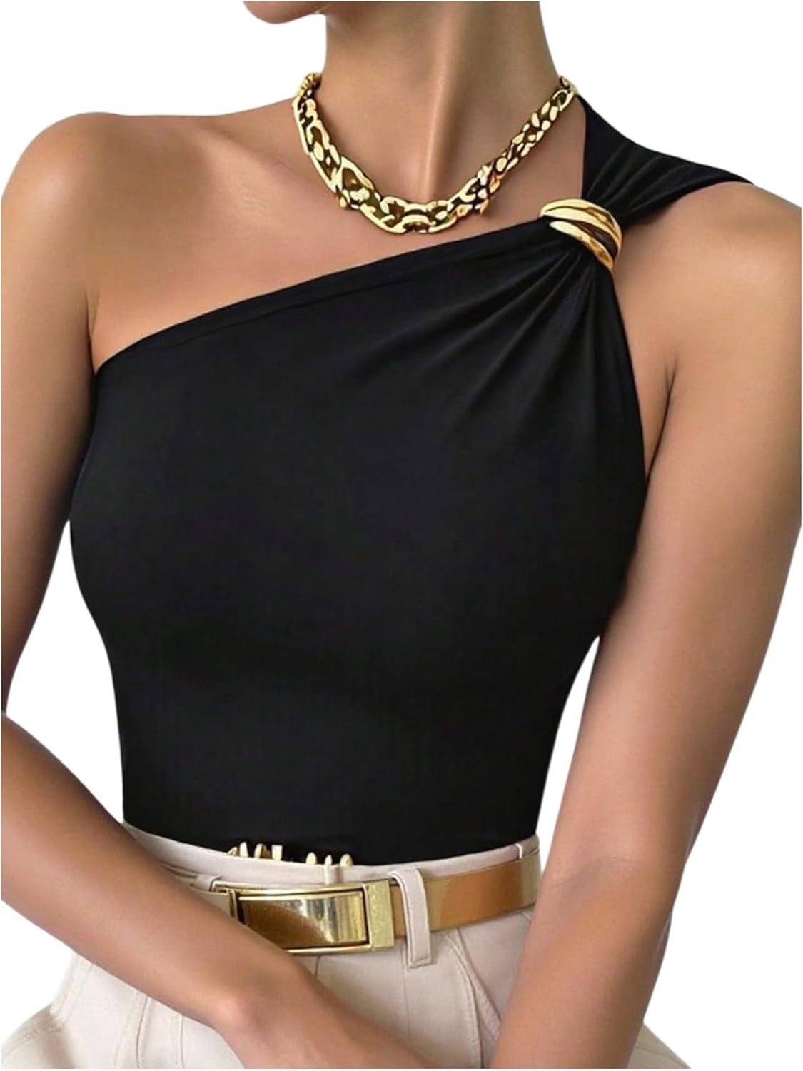 GORGLITTER Women's One Shoulder Tops Metal Flower Ruched Tank Going Out Crop Top