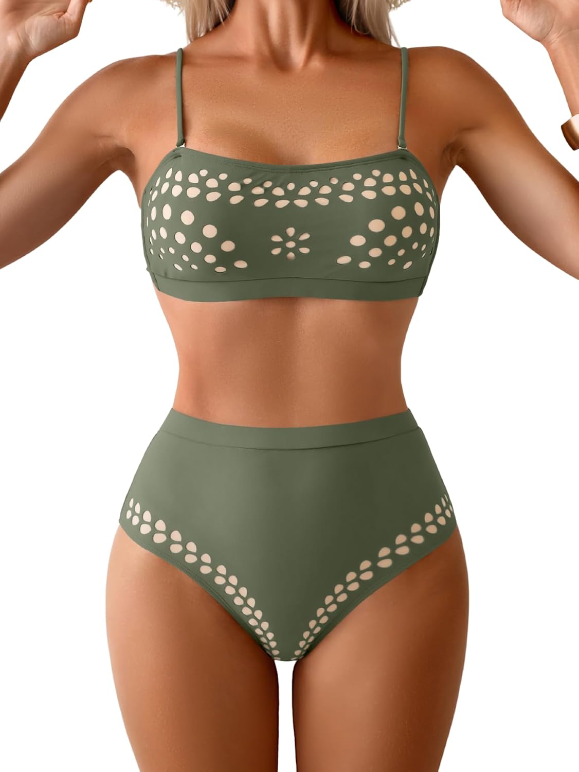 Aidonger Women's High Waisted Bikini Sets Bandeau Two Piece Swimsuits Cutout Tie Back Bathing Suits