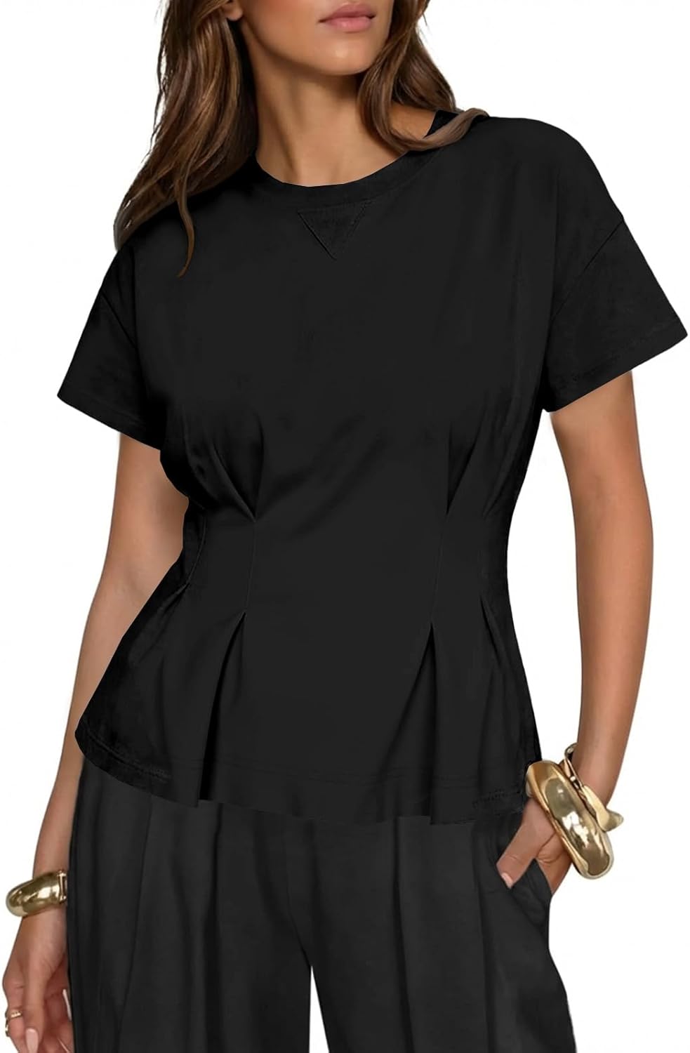 Fisoew Womens Peplum Tops Short Sleeve Babydoll Summer T Shirts Casual Crop Crew Neck Pleated Blouses