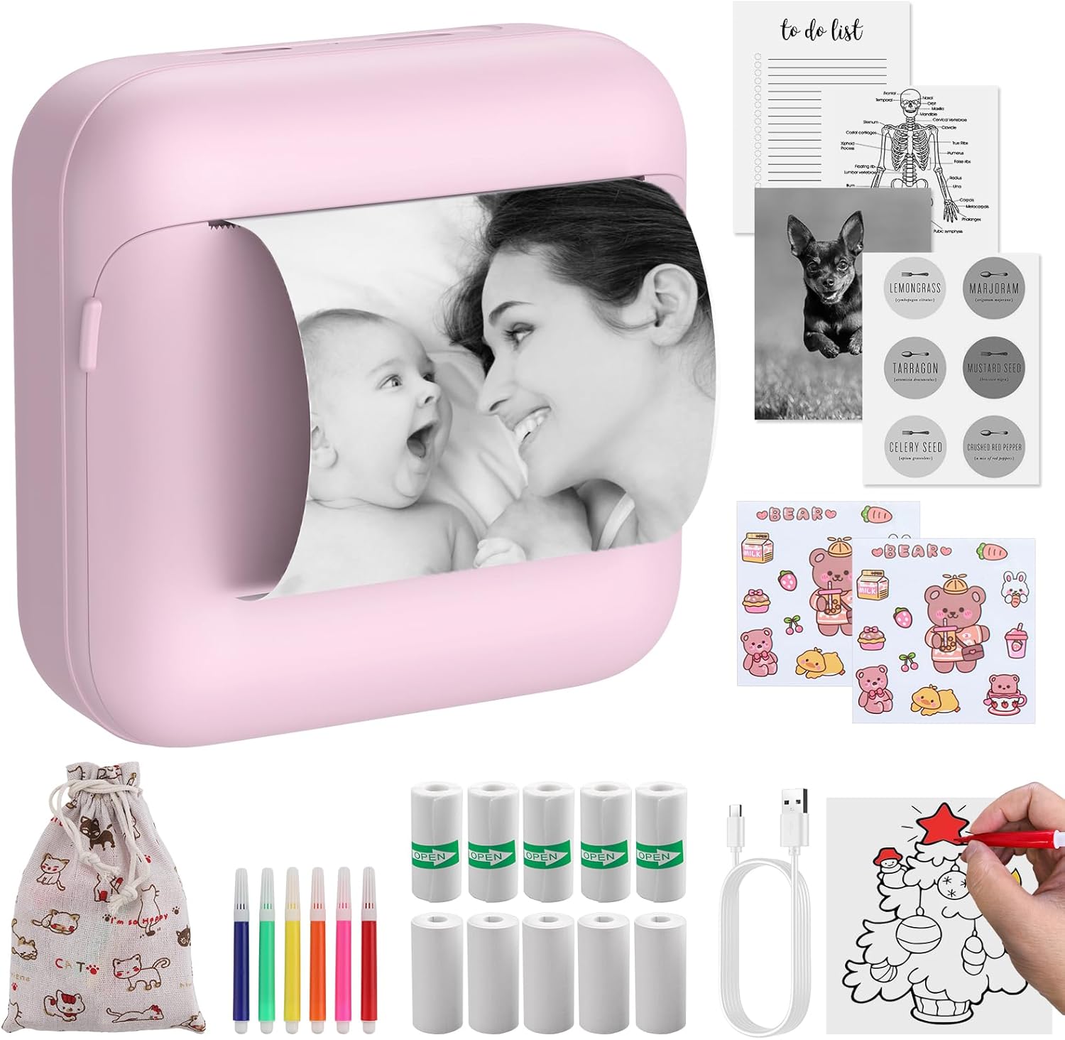 1*Thermal Mini Printer, 5*adhesive printing paper, 5*thermal printing paper ,2*stickers