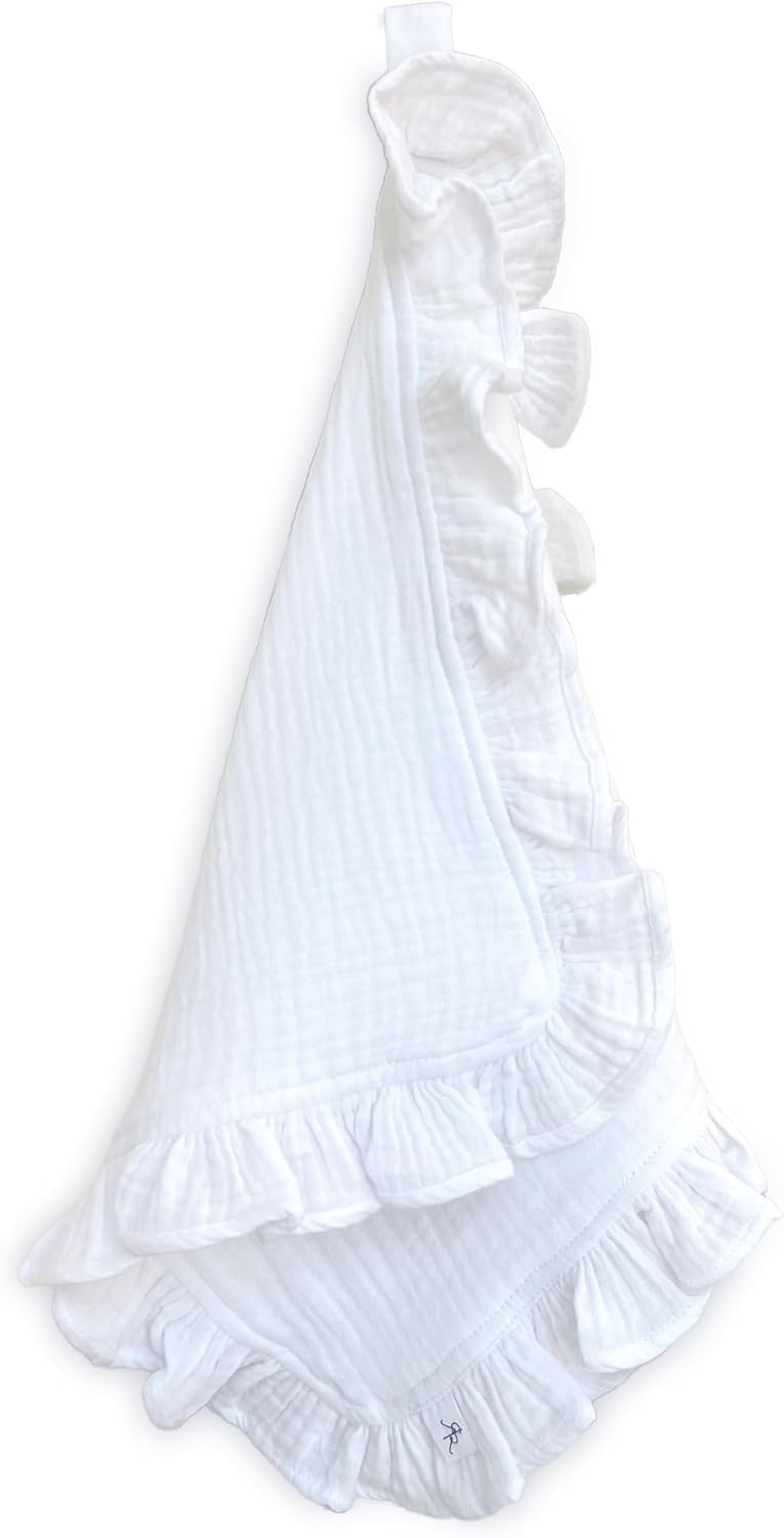 Ryan & Rose Cutie Lovey - Soft 100% Organic Cotton Muslin with Attachable Snap Closure - Baby Lovey Security Blanket (Ruffle White)