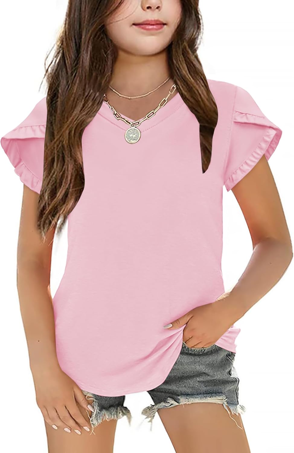 Arshiner Girls T Shirts Double Layer Ruffle Short Sleeve Casual V Neck Kids Summer Tops Blouse Tee