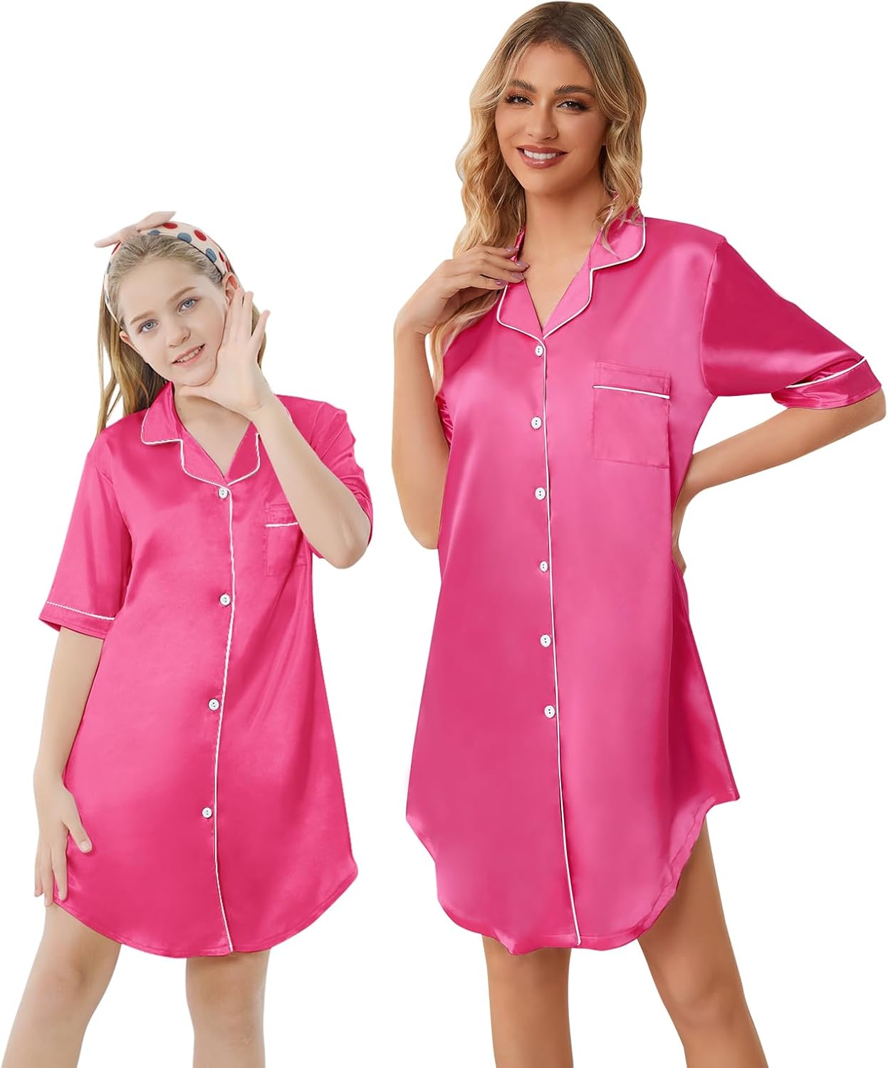 Schbbbta Girls & Women Silk Nightgown, Short Sleeve Button Down Satin Nightshirt Pajama House Dress, 3 Years- Women 2XL