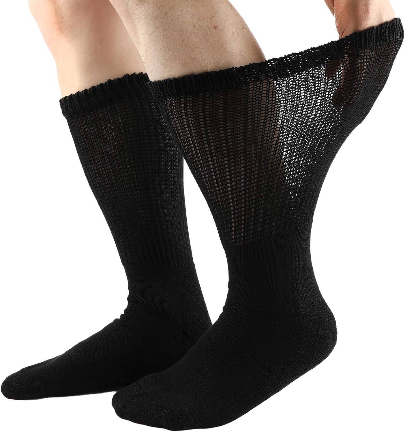 Diabetic Socks for Men Women Loose Fit Non-Binding Seamless Cuff Extra Wide Cotton Crew Socks Black White