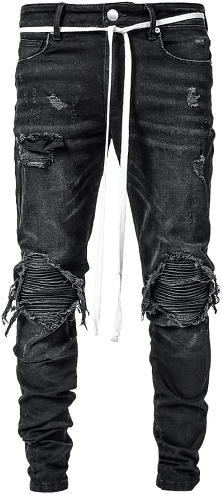 IDEALSANXUN Mens Ripped Stretch Jeans Casual Slim Fit Distressed Plaid Pattern Skinny Biker Jeans