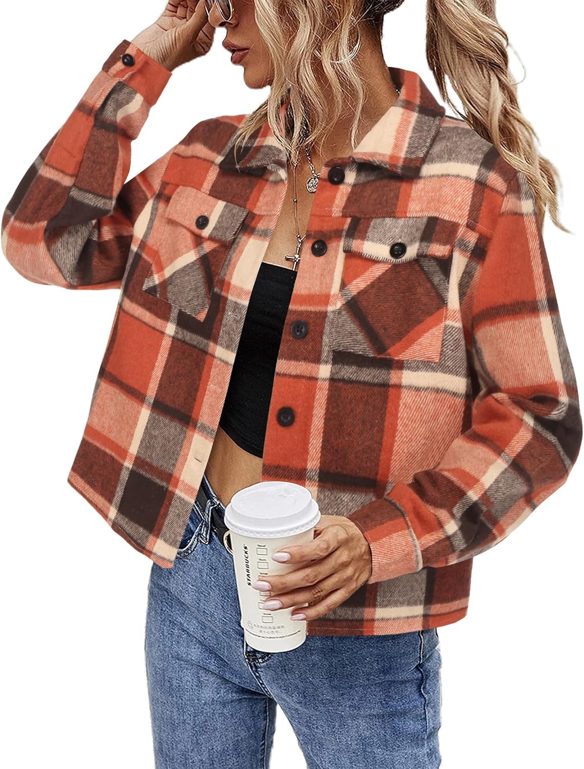 HOTOUCH Red Xmas Jackets Flannel Shirts for Women Cropped Plaid Jacket Shacket Button Down Winter Coats