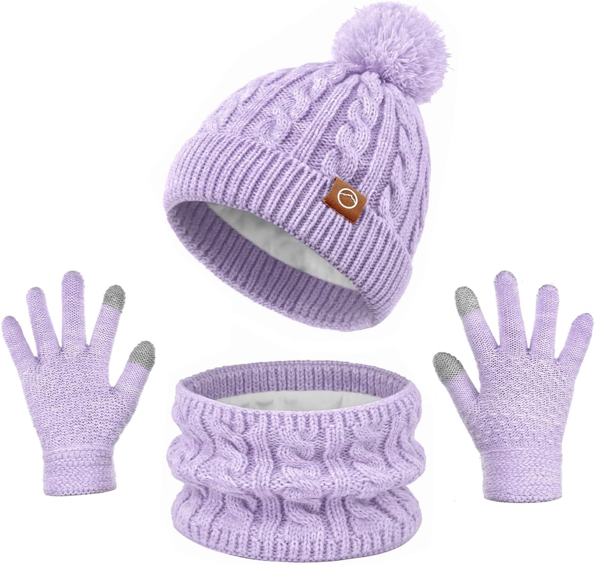 KIRAAT Kids Winter Pom Beanie Hat Scarf Gloves Set,Toddler Girls Boys Warm Knitted Fleece Lining Woollen Cap for 3-10 Years