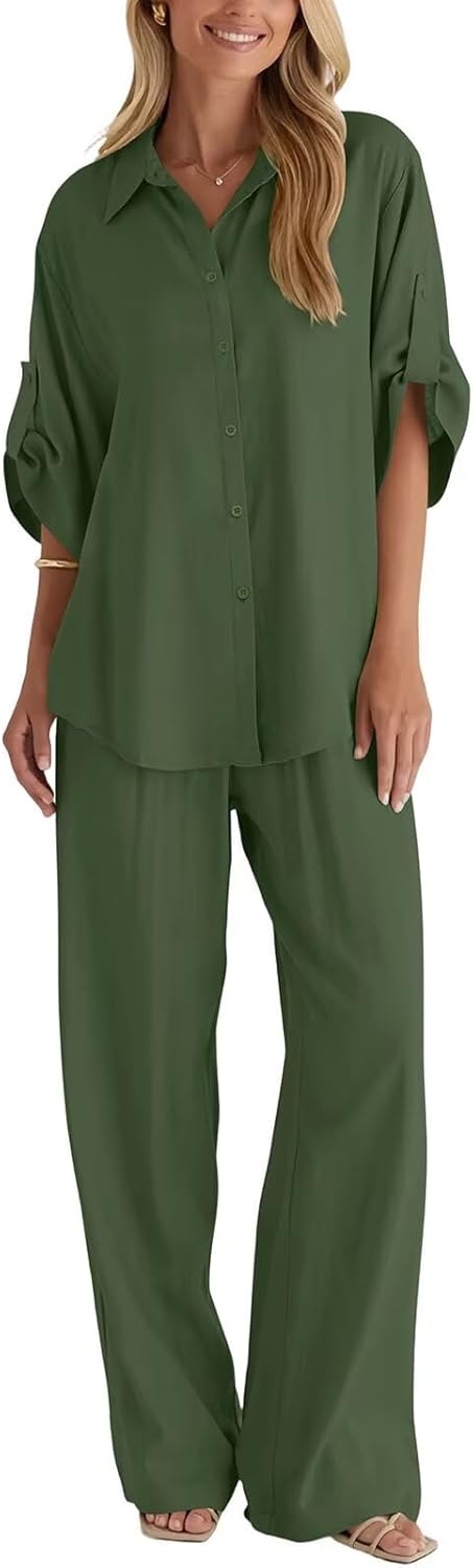 BWQ Womens linen 2 Piece Outfits Long Sleeve Button Down Shirt Wide Leg Pants Lounge Set S-2xl
