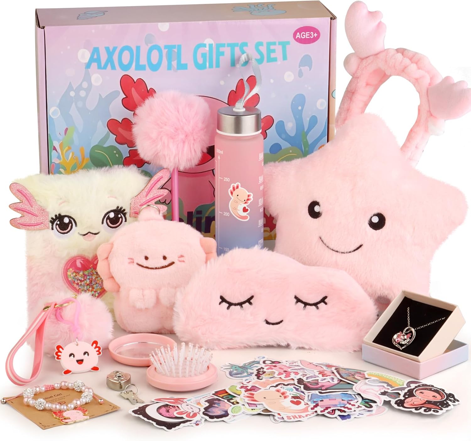 - 【 Axolotl Gifts for Girls Age 3+】 This axolotl gift box set includes a glowing star pillow (requires two AA batteries, not included), a headband, an eye mask, a water bottle, a fuzzy axolotl notebook with a lock, a pen, a axolotl crossbody bag, a keychain, a comb, several axolotl stickers, a axolotl necklace, a axolotl bracelet, and a greeting card.