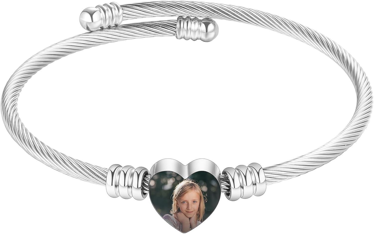 MeMeDIY Personalized Photo Bracelet for Women Engraved Picture Text Name Gold/Silver/Black Open Cuff Bangle Bracelet Heart Charm Custom Jewelry Gift for Mom Wife Friend