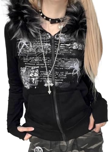 Y2K Grunge Faux Fur Hoodies For Women Zip Up Vintage Punk Gothic Graphic Jacket Long Sleeves Ribbing Streetwear