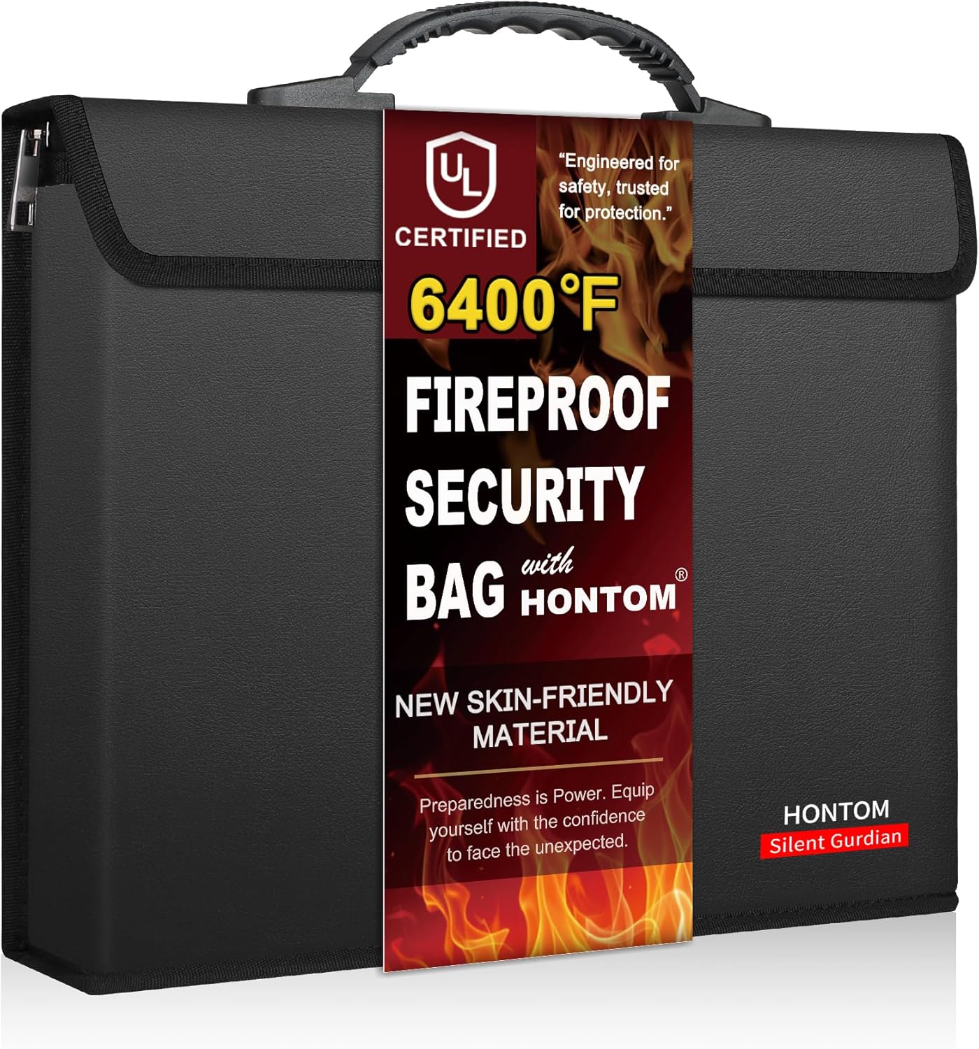 Hontom Fireproof Document Bag with 2 Pockets, 6400℉ Upgraded Material Fireproof Money Bag with Lid, Travel Home Fire Safe Storage Cash Pouch for Important Documents
