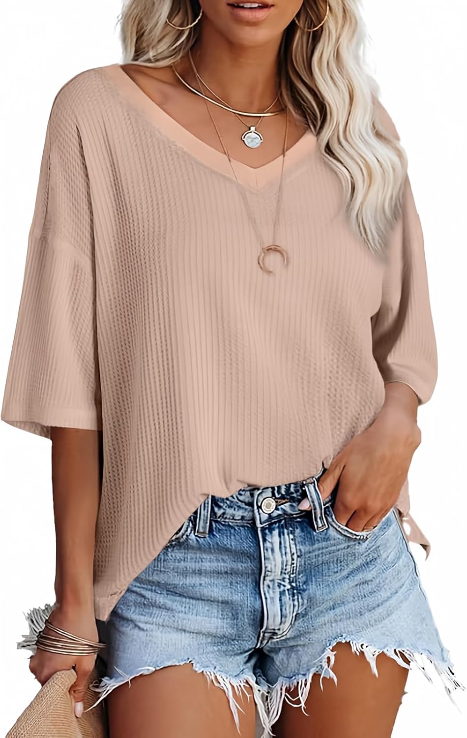 SHEWIN Women's Casual V Neck Waffle Knit Tunic Tops Batwing Short Sleeve Shirts Loose Blouses