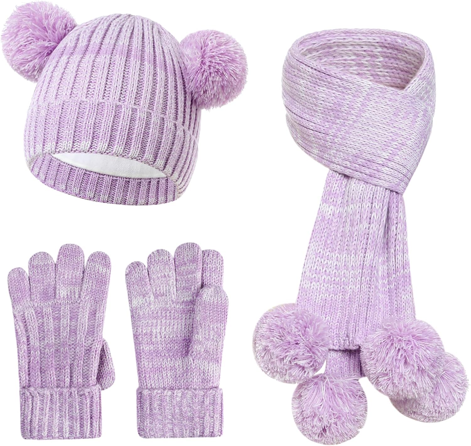 Kids Winter Hat Gloves Scarf Set, Double Pom Beanie Warmer Mittens Fleece Lined 3-Piece Set for Boys Girls