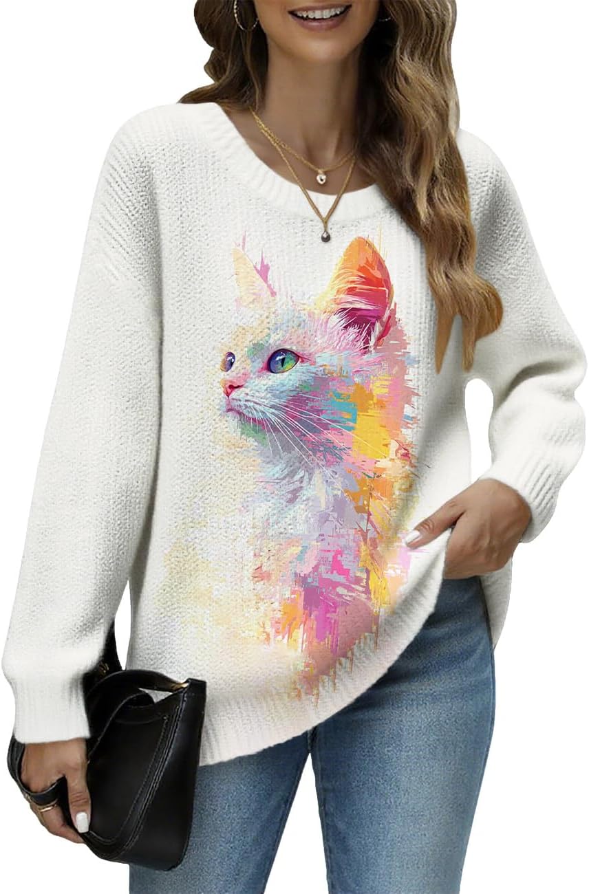 Women's Cats Sweater Animal Printed Oversized Casual Loose Knit Tops Christmas Long Sleeve Funny Clothes Winter Fall