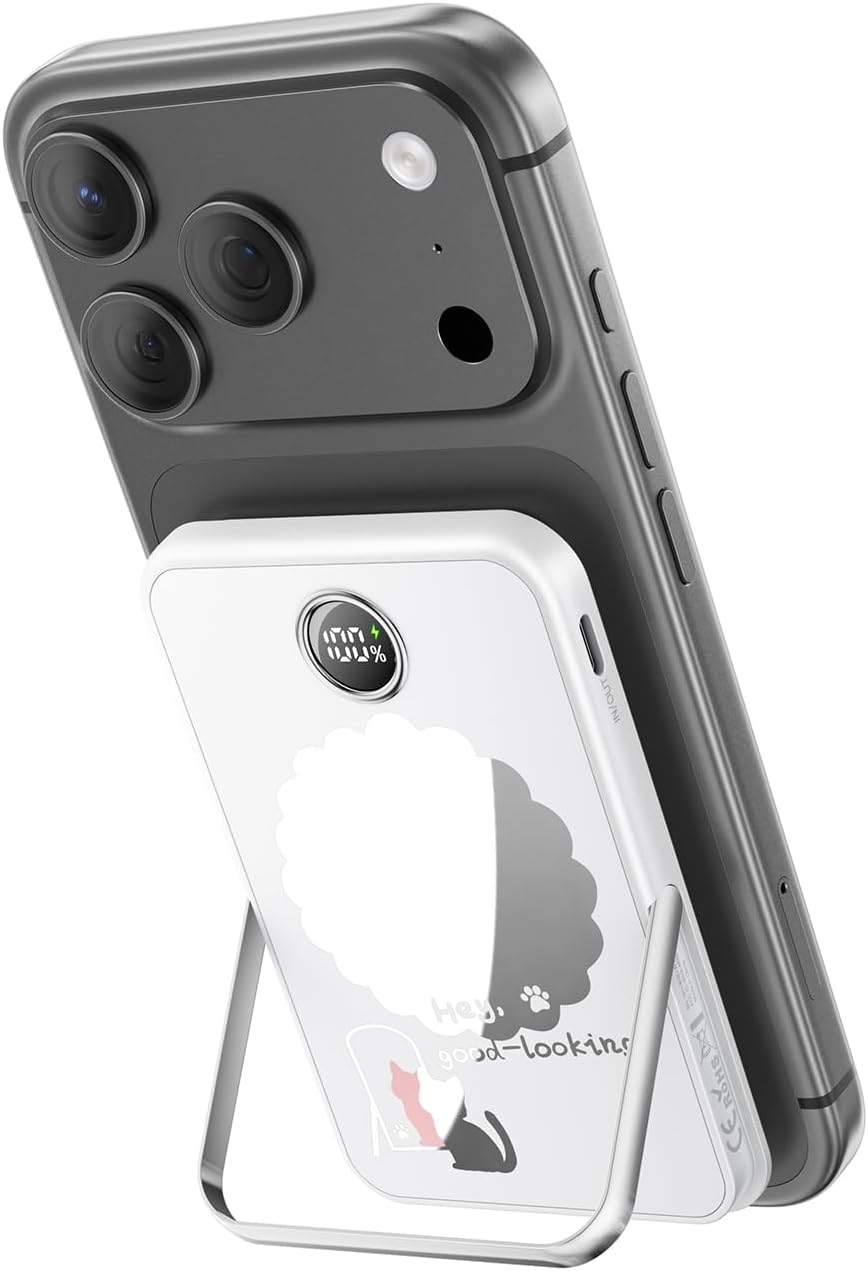 iWALK Magnetic Portable Charger 5,000mAh, Wireless Power Bank with Mirror & Foldable Stand, Ultra Slim Battery Pack with USB-C Cable, MagSafe Compatible for iPhone 17/16/16 Plus/16 Pro/15/14/13/12