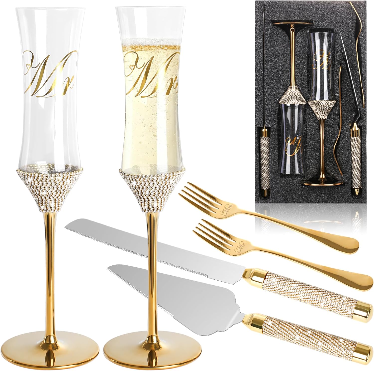 - ELEGANT AND REFINED DESIGN: The wedding toasting flutes and forks are engraved with Mr and Mrs, while the handles of the flutes and the knifes are adorned with rhinestones, give people an elegant and noble feeling, very unique and beautiful, shining brightly. These wedding toasting glasses are exquisite, ideal for grand occasions such as weddings.