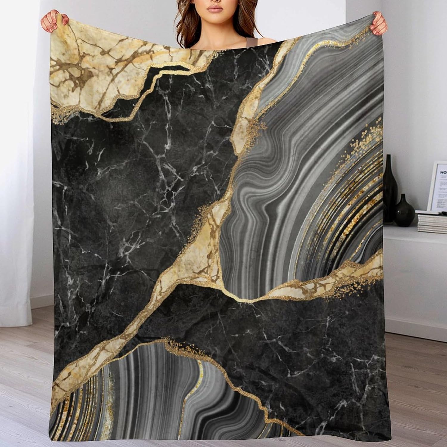 Black Gold Marble Throw Blanket Modern Abstract Art Pattern Soft Lightweight Warm Plush Blankets for Sofa Bedroom 30"x40"