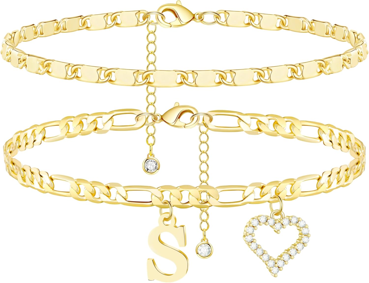 Initial Ankle Bracelets for Women Waterproof 14K Gold Plated Dainty Layered Figaro Chain Letter Initial CZ Heart Ankle Bracelets Set Summer Beach Jewelry for Women