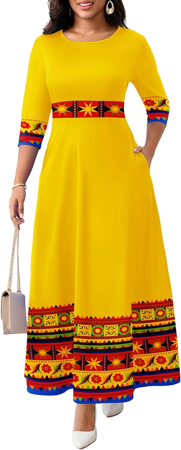FANDEE Casual Maxi Dresses for Women Elegant 3/4 Sleeve Round Neck Africa Print Church Dress with Pocket
