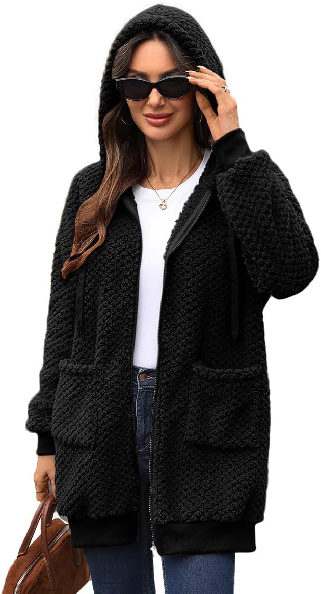 Women Mid-Long Fleece Zip Up Jacket Sherpa Hoodie Fuzzy Jacket Warm Winter Teddy Coat with Pockets