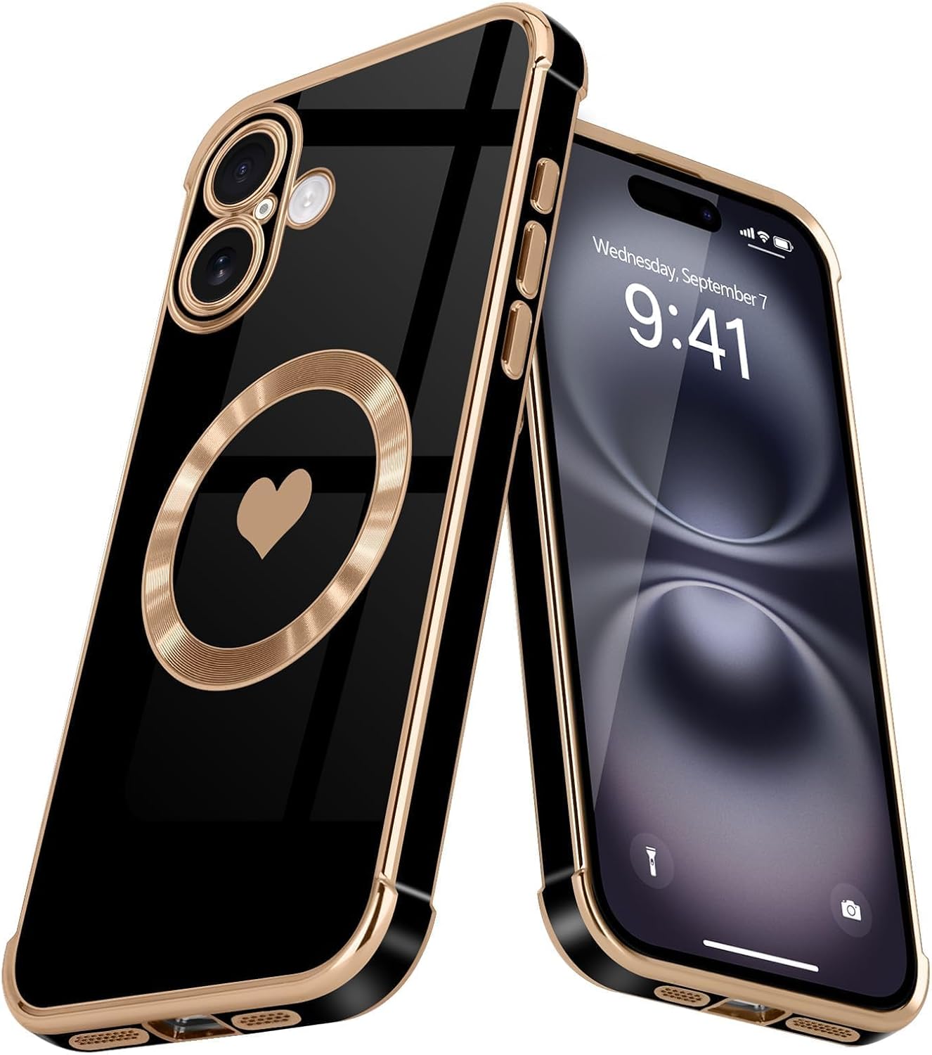 Magnetic Case for iPhone 16 Plus Women Girl Luxury Plating Cute Love Heart Slim Cover Full Camera Lens Protection Compatible with MagSafe for iPhone 16 Plus,Black