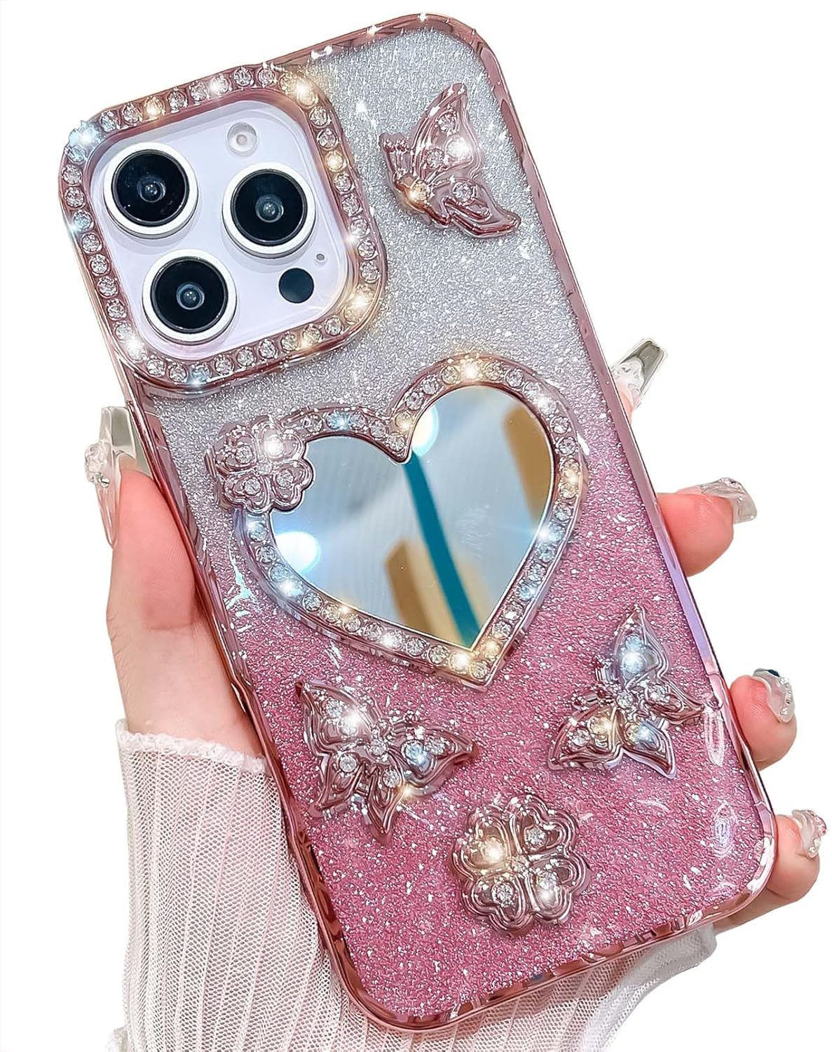 KERZZIL Trendy Girly Heart Mirror Compatible with iPhone 16 Pro Max Case, Elegent Cute Slim Women Bling Glitter Diamond Rhinestones Plating Butterfly Phone Cases(Rose Gold,16 Pro Max)