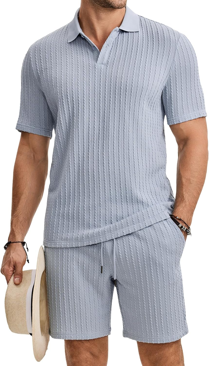 JMIERR Men's Summer Beach Outfits 2 Piece Jacquard Knit Lounge Short Sleeve Shirts & Shorts Vacation Texture Sets