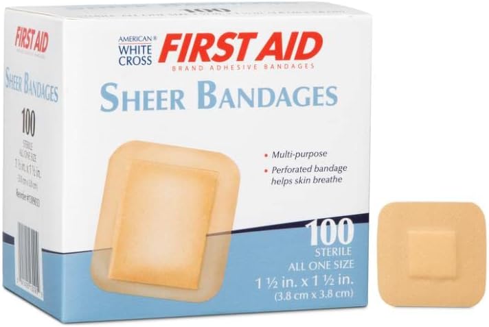 American White Cross First Aid Sheer Plastic Adhesive Spot Bandage Sterile 1-1/2 X 1-1/2 Inch 100 per Box