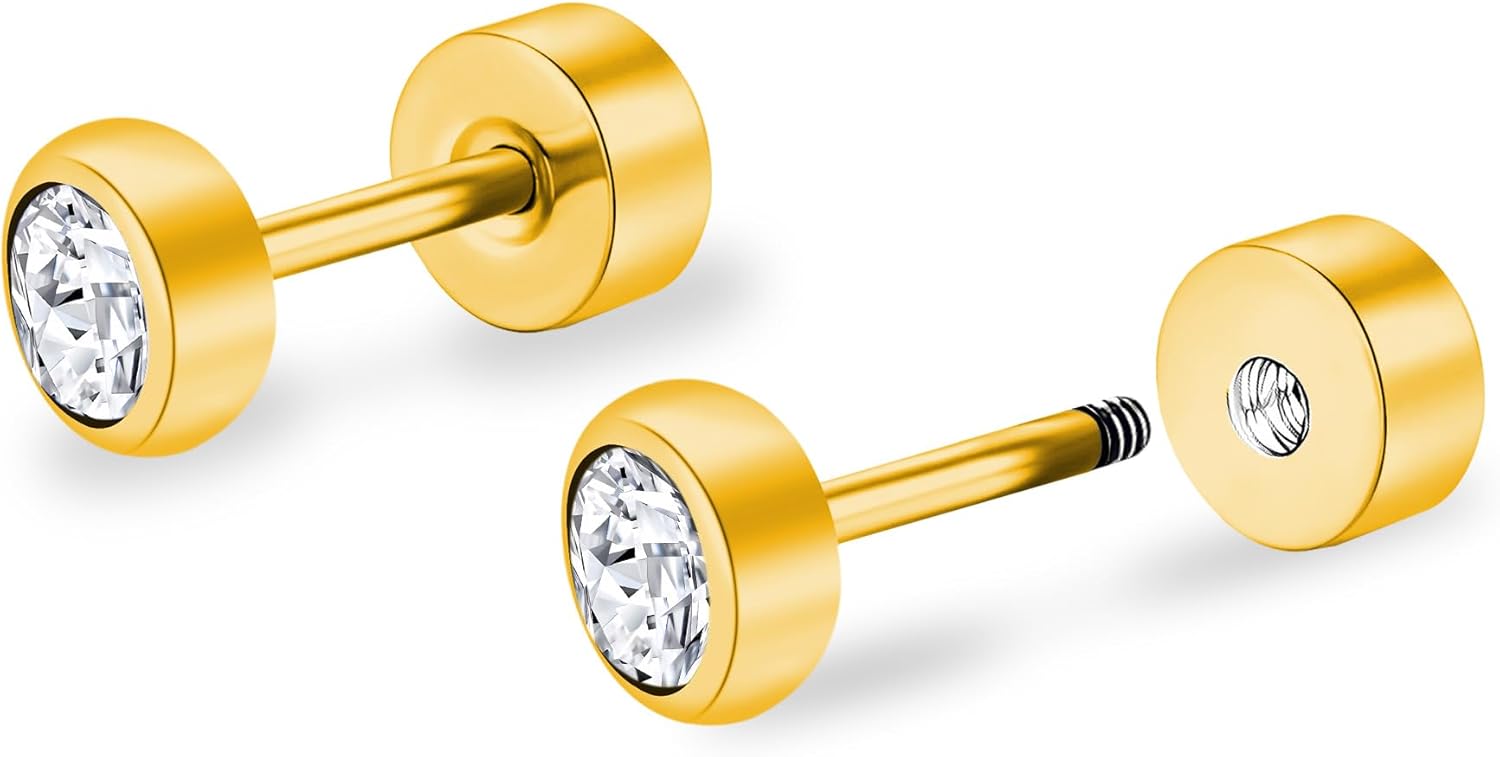 ZDE Titanium Women Flatback Earrings for Women Crystal Gold Stud Earrings Flat Back Earrings Hypoallergenic Cartilage Earring Helix Tragus Conch Piercing 3mm-5mm