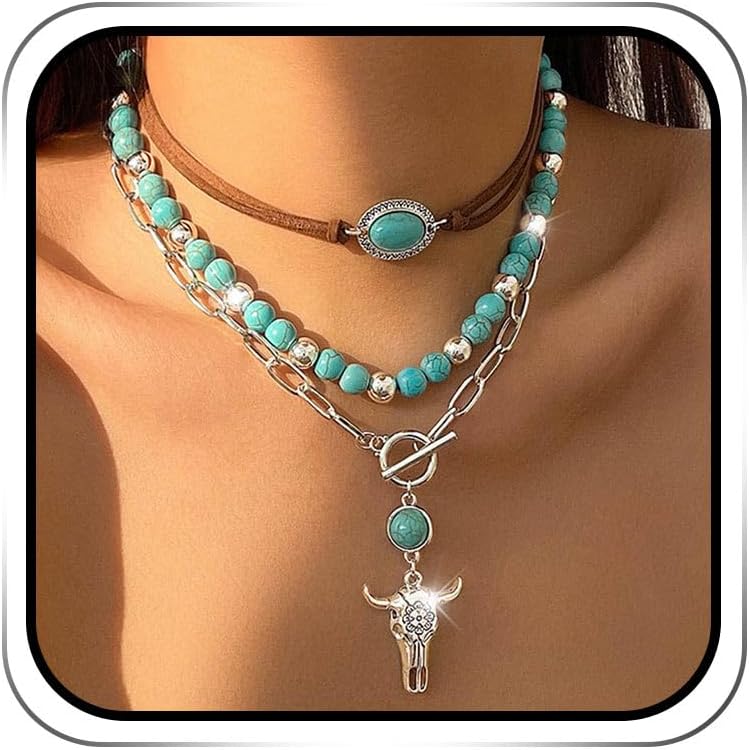 Jovono Boho Choker Necklace Silver Cowgirls Boot Pendant Necklaces Turquoise Western Necklace Chain for Women