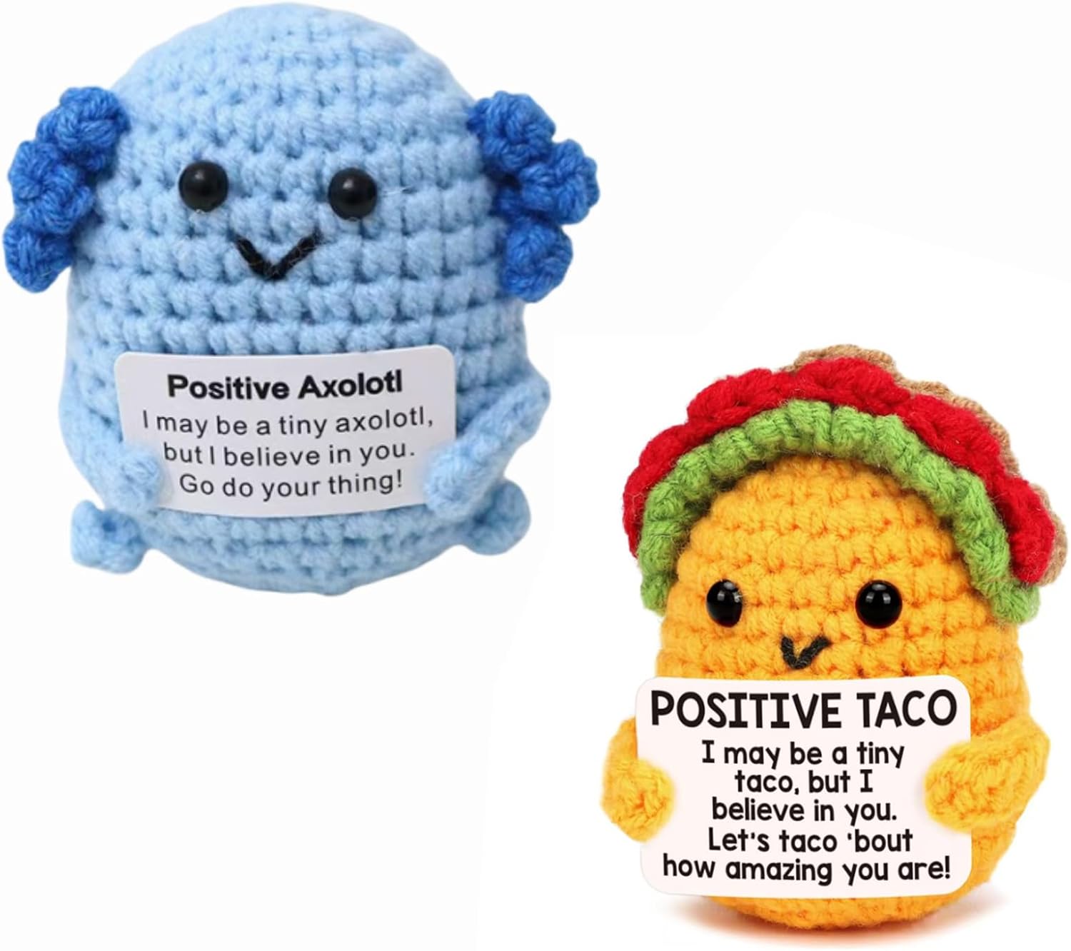 2pcs Handmade Positive Crochet Animals Cute Emotional Support Plush Crochet Mini Taco Axolotl Funny Knitted Wool Stuffed Animal Cheer Up Gifts for Women Men Friends Coworkers