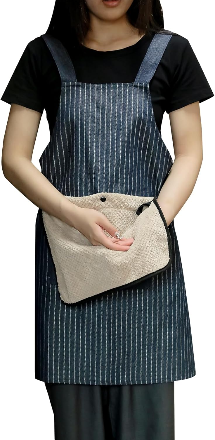 Welan Apron for Women with Pocket, Cross Back No Tie Pinafore No Tie for Kitchen Garden Cooking with Hand Wipe (2 Colors)