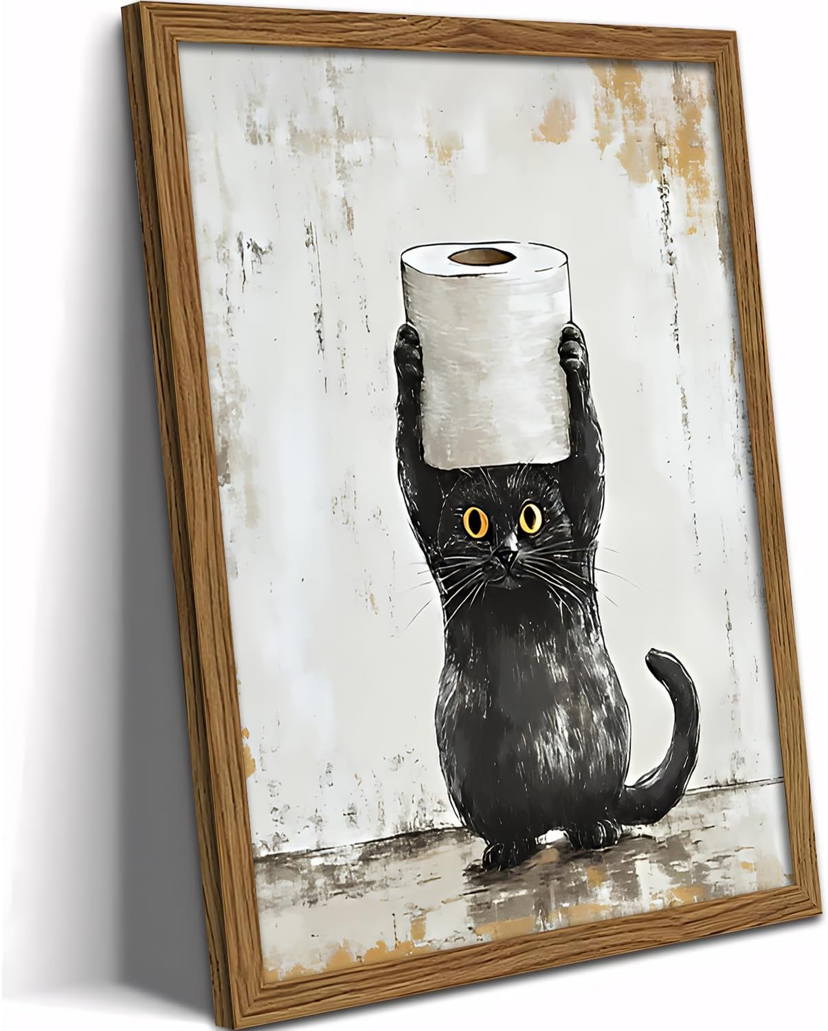 JZMGGQQ Funny Black Cat Bathroom Wall Art, Cute Kitten with Toilet Paper Rustic Farmhouse Wall Decor, Whimsical Animal Canvas Art for Bathroom Restroom, Natural Wood Frame 16x12 In
