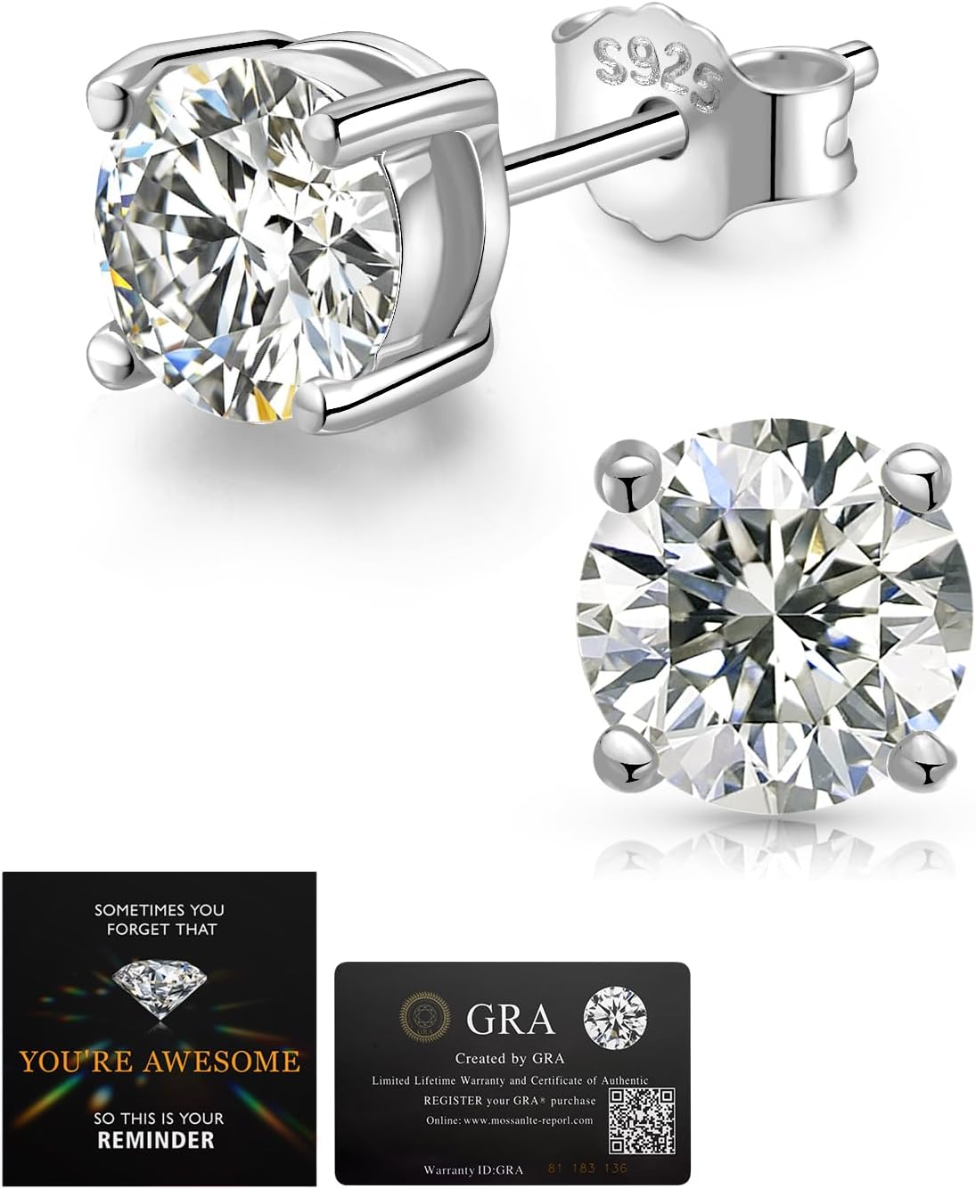 Moissanite Stud Earrings for Women Men D Color VVS1 Clarity Round Cut Lab Created Diamond 925 Sterling Silver 18K White Gold Plated Jewelry