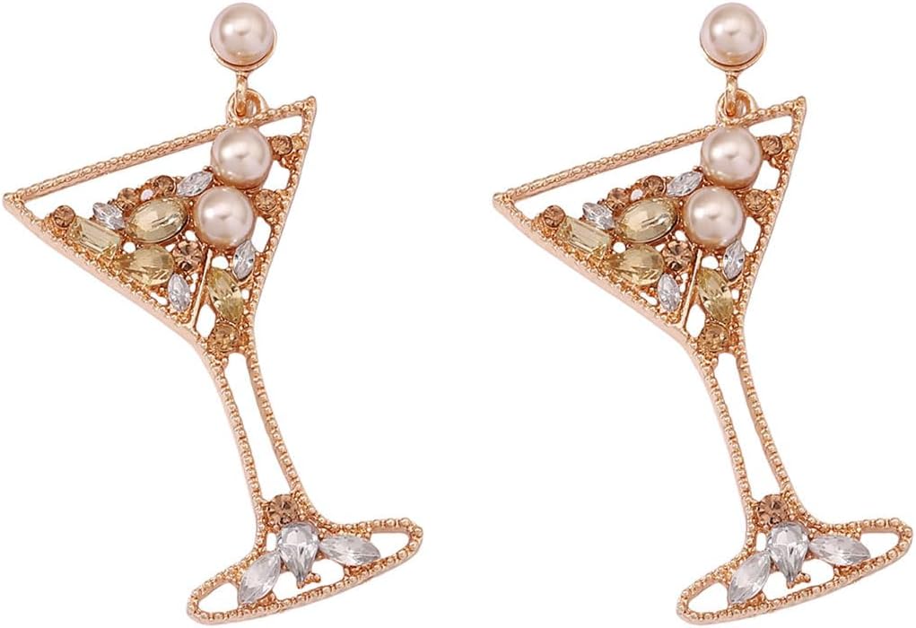 Handmade Champagne Martini Wine Glass Dangle Earrings Shiny Rhinestones Crystal Pearl Beaded Drop Charming Cocktail Glass Lovely Earrings for Women Jewelry