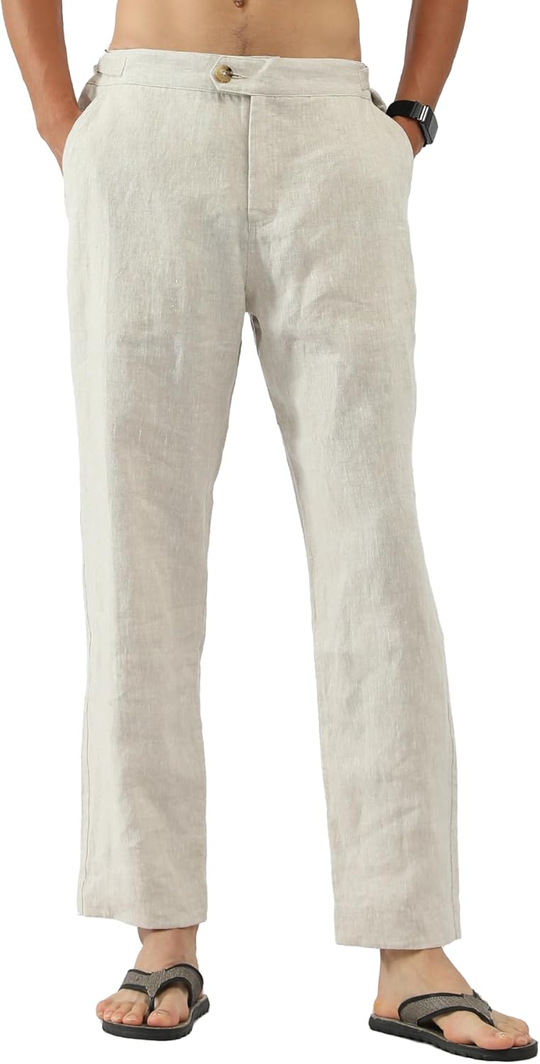 Men's 100% Linen Casual Pants with Adjustable Waist Tabs Tapered Leg Summer Linen Lounge Trousers